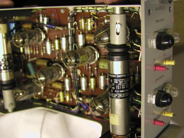 Einige Impressionen: Das Bild unten links zeigt einen der drei Operationsverstärkereinschübe - beide Verstärker dieses Systems sind zerhackerstabilisiert. Auf der rechten Seite des linken Bildes ist einer der mechanischen Zerhacker zu sehen, der für beide Verstärker eines Modules eingesetzt wird. Die Zerhacker werden mit 100 Hz betrieben. Das Bild rechts zeigt das kleine austauschbare Steckfeld - bemerkenswert ist der Aufbau dieses Steckfeldes: Die Rechenelemente sind nicht als mathematische Funktionen dargestellt und umgesetzt, sondern als einzelne aktive und passive Elemente, die erst zu komplexeren Rechenelementen zusammengeschaltet werden müssen (z.B. Integrierer etc.). Eine solche Anordnung findet sich vor allem bei kleinen und sehr kleinen elektronischen Analogrechnern, da sie eine optimale Ausnutzung der wenigen Elemente ermöglicht - allerdings um den Preis einer komplexeren Programmierung, die nicht auf fertige mathematische Elemente zurückgreifen kann. |