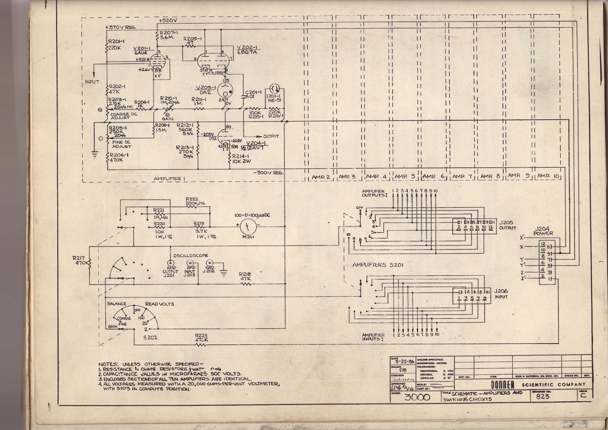 The schematic above shows the circuitry generating the five voltages for initial conditions. These are derived from the five distinct secondary windings of T102. Each of these outputs is fed to a selenium rectifier followed by a filter capacitor, a power resistor and a stabilizer tube type OB2. The actual initial condition is set by means of a 10k potentiometer connected to this stabilized voltage. The right side of the schematic shows the relays used to control the integrators. A typical integrator has three modes of operation: IC (initial condition), OP (operate), and HALT. In simple cases it is sufficient to control these modes manually, but to obtain a stable picture on an oscilloscope it is desirable to switch the integrators between IC and OP automatically. This can be done by means of an additional unit, the "Cyclic Reset Generator" which controls the control grid of V114 which in turn drives the relay controlling IC and OP mode. With the power supply fixed, it was time to turn our attention the amplifier chassis. The picture below shows the schematic of this unit: