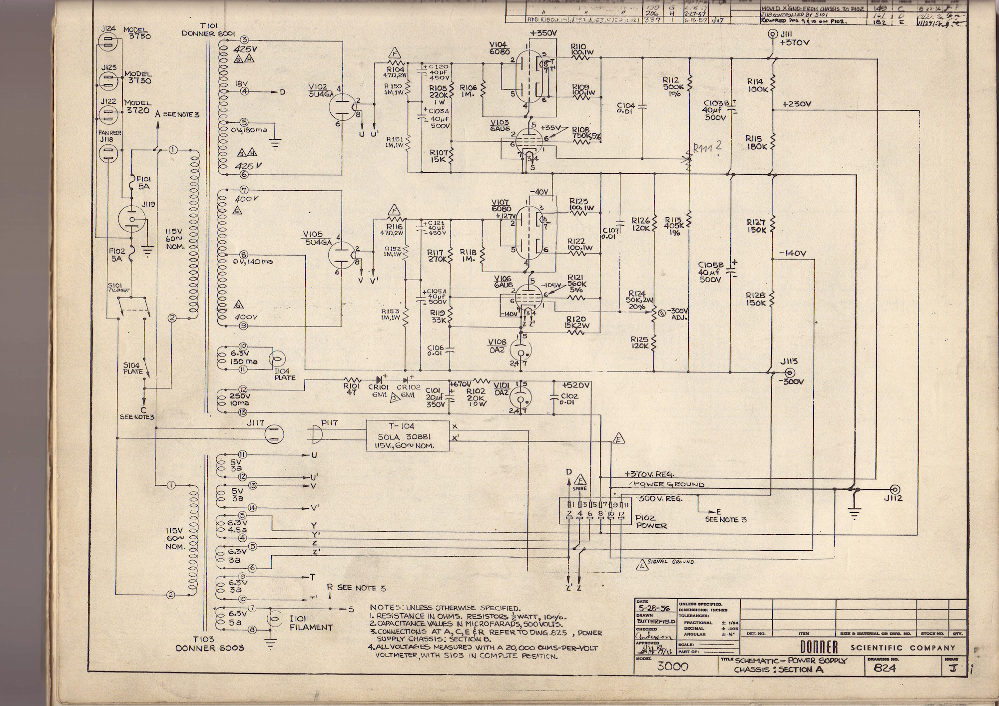In order to switch on the computer, S101 is closed, applying power to T103 which generates most of the required filament voltages (not only for the power supply itself, but also for the amplifier chassis holding 10 individual operational amplifiers). After about a minute or two, S101 closed which powers T101. The secondary winding shown on top has two 425 V taps which are connected to a dual rectifier tube V102. The output of this rectifier is filtered and fed to a linear regulator consisting of a dual power triode V104. The grids of both triodes which are paralleled, are driven by V103 which compares the output voltage against the stabilized -300 V output (more about this in the next section). The second secondary winding has two 400 V taps feeding another dual rectifier tube and a linear regulator circuit quite similar to that described above. The main difference is the stabilizer tube V108 connected to the cathode of the pentode V106. This subcircuit generates a stabilized -300 V output which serves as a reference for the +370 V circuit above. The secondary winding at the bottom of T101 delivers 250 V and feeds a selenium rectifier CR101/102. After passing the power resistor R102, this voltage is stabilized at +150 V by V101. Since the cathode of V101 is connected to the +370 V output of the topmost linear regulator the voltage on the plate of V101 is +520 V (this was the connection that was missing).