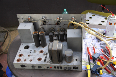 After we added a wire connecting the lower end of the +150 V supply and the +370 V rail all voltages were now correct so that we could have a look at the amplifier chassis. The picture on the left shows the working power supply with the amplifier chassis connected to it during a short test run. The voltages turned out to be a bit too high, so the stabilized -300 V voltage was adjusted accordingly, bringing the other voltages within range, too. |