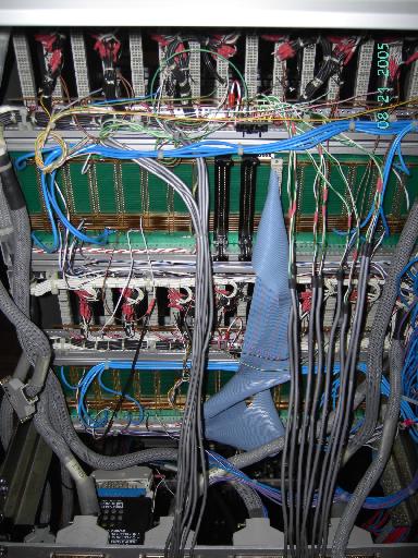 The picture on the left shows the backplane of the analog part of the DO-950. The picture on the right shows the central ground block with some wires still unattached (this picture was taken during the setup of the computer). |