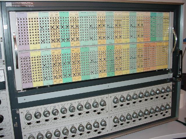 The pictures to the right shows all of the modules mounted behind the removable analog patch panel. The contacts between the modules and the patch cables are made by plated metal contact fingers against which the cables are pressed when the panel is inserted. Each module has its corresponding front template on the patch panel which is color coded to simplify programming. An integrator, for example, has a green template, an operational amplifier a yellow one, etc. The modules are layed out in a manner that allows the extensive usage of bottle plugs for programming since all patch holes are equidistant and about sixty percent (according to Hitachi documentation) of all necessary interconnections to solve a given problem can be setup using bottle plugs instead of lengthy (and thus quite sensitive) patch cables. |