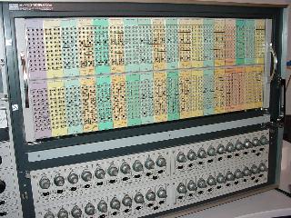 On the left the coefficient potentiometer bays are shown - there are four bay of ten potentiometers each. By the way: The analog patch panel is divided into fours sectors, too, with a one to one correspondence to the potentiometer bays. Below each potentiometer is a small switch which is used to facilitate setup of the potentiometer in a computing circuit. In the setup position the input of the potentiometer is hard wired to +10V, while the output is connected to a reference circuit consisting of the precision potentiometer located on the control panel and the zero meter. To set a potentiometer to the precalculated value necessary for some given computation, the desired value is first set on the reference potentiometer. In the next step the potentiometer to be set up is selected by pushing its associated setup switch. Then this potentiometer is turned until the zero meter shows no difference between these two potentiometers. |