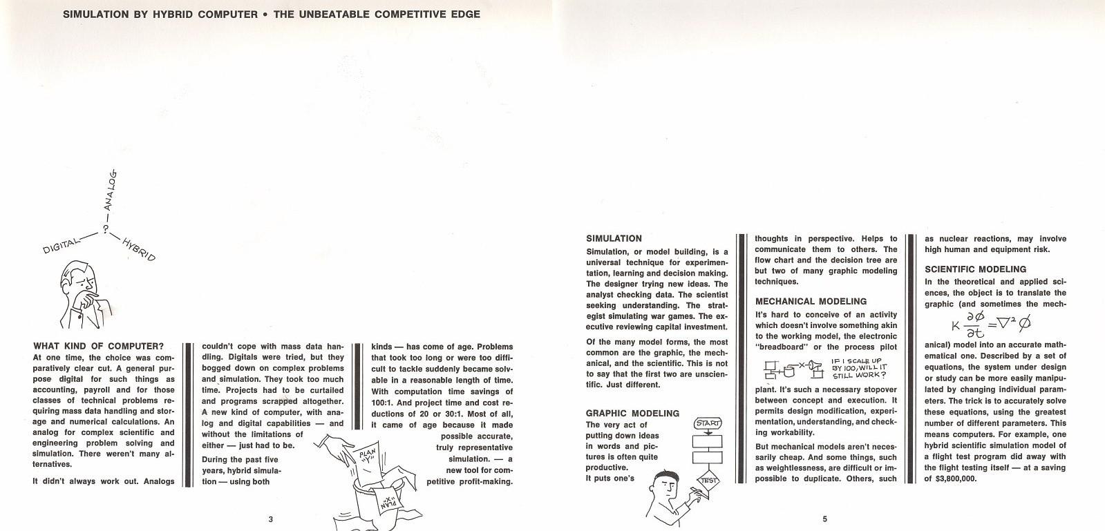 The following pictures are scans of the EAI brochure "Simulation by Hybrid Computer - the Unbeatable Competitive Edge". I would like to thank Mr. Knut Rothstein who donated this brochure and also prepared the following scans of the brochure. The brochure covers the advantage of analog and hybrid computation over a pure digital approach from a cost and effectiveness perspective - technical features are omitted quite exclusively. This makes this material quite interesting from a historical point of view since it gives a wonderful impression of the struggle between the proponents of analog and digital computing in a time where digital computers were far from being really interactive devices. |